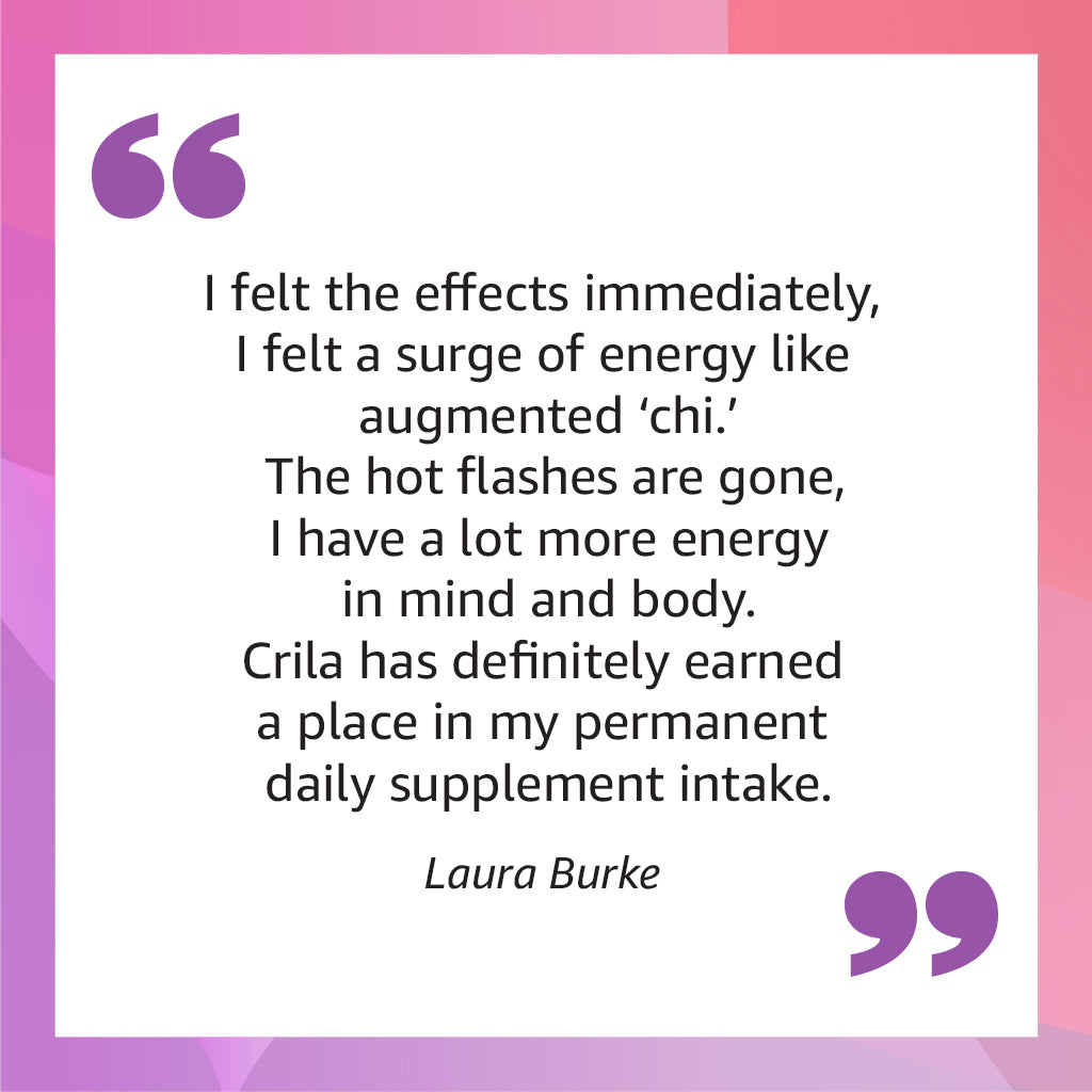 “Crila® actually works for menopause . . . I’m determined not to run out until I know I don’t need it any more — because I know how that feels.” Denise H., California