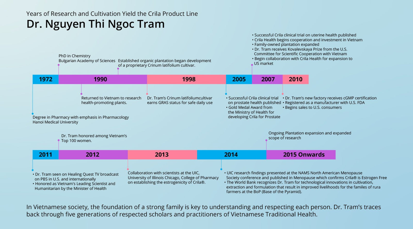 Since the 1980s, Dr. Tram has devoted her work to the evidence-based scientific study of the herbs used in Vietnamese Health Traditions